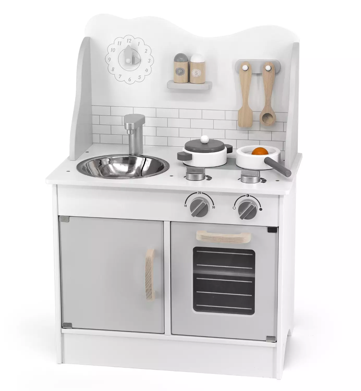 Leikkikeittiön mukana tulee kattava setti tarvikkeita, jotka tekevät leikistä heti valmista ilman lisähankintoja: