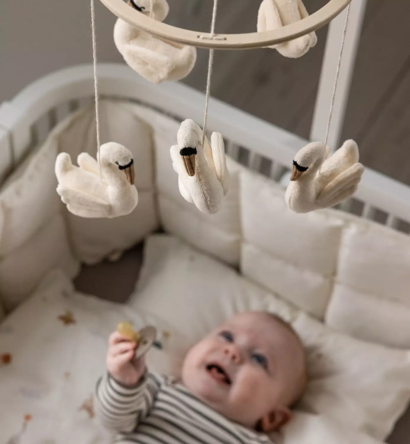 Rauhoittava ja ajaton vauvan mobile, jossa viisi pehmeää joutsenta leijuu kevyesti kauniista puisesta renkaasta eri korkeuksilla. Mobile luo lempeää liikettä ja tuo ripauksen taikaa vauvan sängyn, hoitopisteen tai leikkialueen ylle.