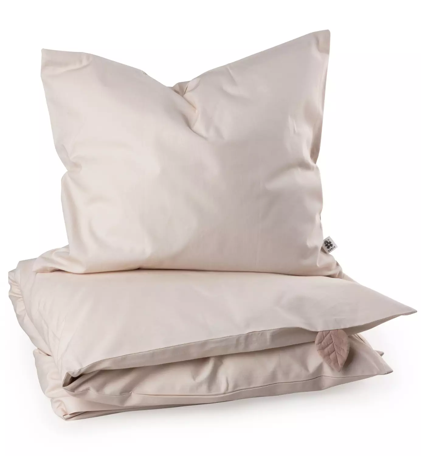 Perkaalista valmistettu vauvan vuodevaatesetti, ihanassa hillityssä värissä joka sopii moneen sisustukseen. Luomupuuvillasta valmistettu setti sisältää vauvan pussilakanan ja tyynyliinan, molemmissa piilotettu YKK-vetoketju, joka ei häiritse pienen unta. Peitonpäällisessä on suloinen koristetikkaus ja pieni vihreä lehtiläppä, joka toimii unikaverina uneliaille sormille.