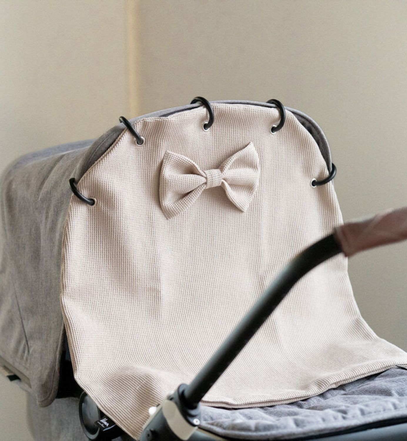 Suloista ja peittävää, vohvelikankaista vaunuverhoa koristaa rusetti.
